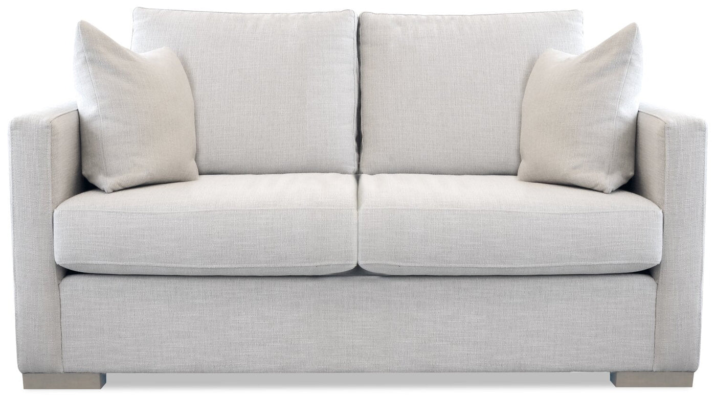 This loveseat includes two accent pillows in matching cream-coloured fabric. |