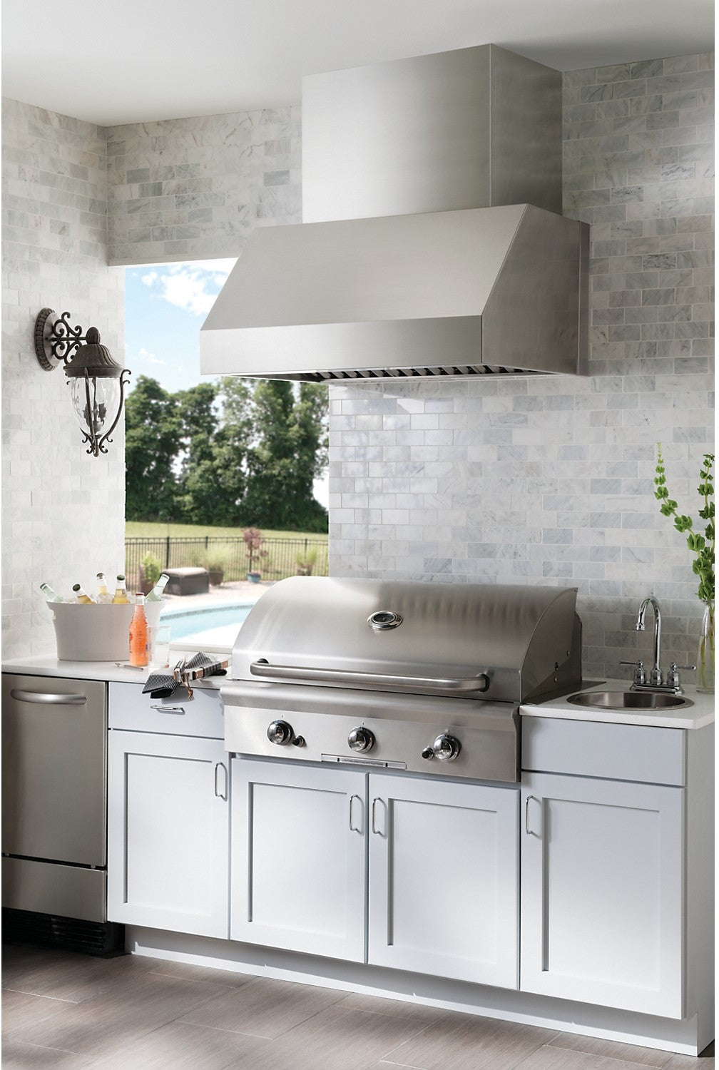 Made for the outdoors, this chimney-style hood has been brushed with stainless steel to resist corrosion.