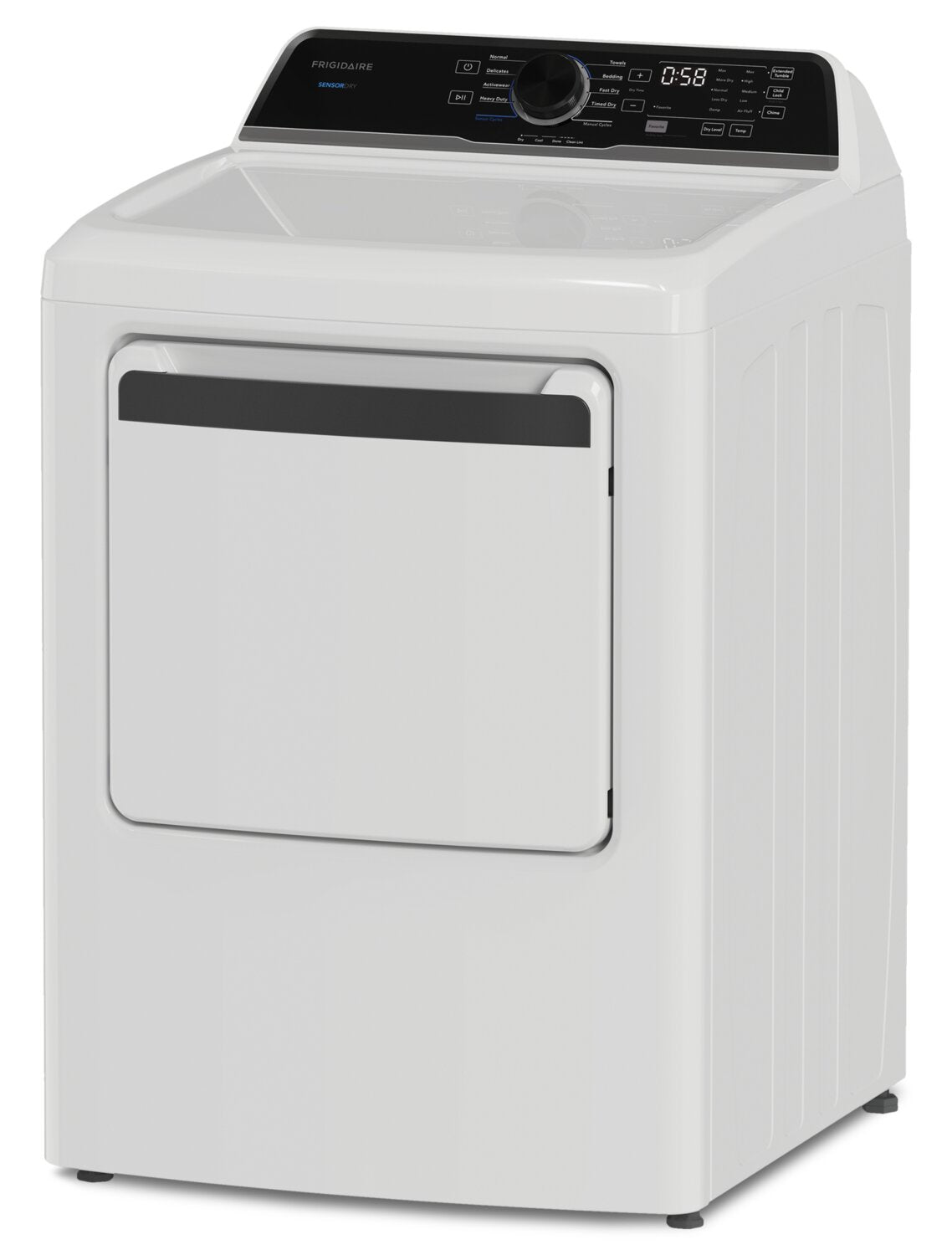 Dry more at once and get laundry done faster with this Frigidaire electric dryer, built to handle up to 25 towels in a single load. Choose from ten dry cycles and five dryness levels to care for everything from delicate fabrics to bulky bedding. Features like SENSORDRY™ technology detect moisture and stop the cycle when clothes are perfectly dry, providing excellent fabric care and helping to prevent over-drying. Plus, a 30-minute Quick Dry handles last-minute needs, making this dryer perfect for adding everyday convenience to your laundry routine.