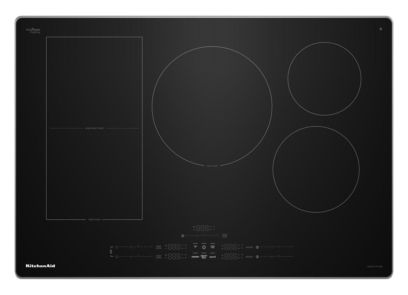 This 30" induction cooktop from KitchenAid helps you take on cooking adventures of all kinds with delicious results every time. Temp Cook™ induction technology maintains the temperature you set for precision beyond high, medium and low settings, while Temp Cook™ smart presets help you perfectly sear salmon, gently simmer sauces, quickly boil water and more. Plus, the Even-Heat™ zone adds versatility to cook with large pans like griddles or two pans at once. Enjoy reliable, adaptable cooking with this sleek cooktop.