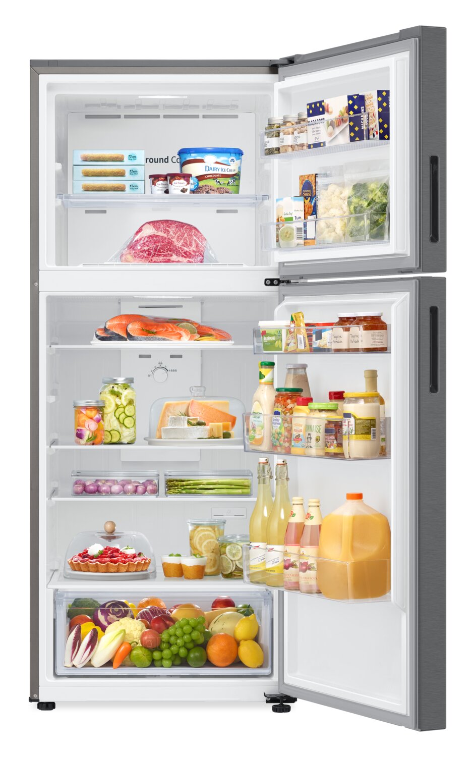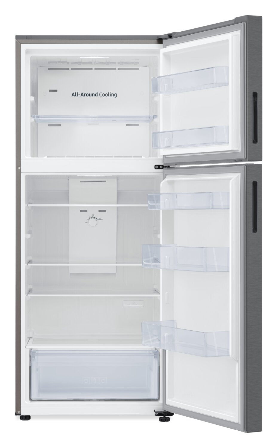 Keep all of your frosty treats within convenient reach in this Samsung refrigerator. Enjoy extra food space with a fridge that works efficiently in temperatures ranging from 3.3 to 43 C, making garage storage a breeze. Plus, a reversible door can be installed to open from either the left or right to best accommodate your needs. All-around cooling maintains a consistent temperature to keep contents fresh and delicious, while no-frost technology ensures ice is kept to a minimum without manual scraping.
