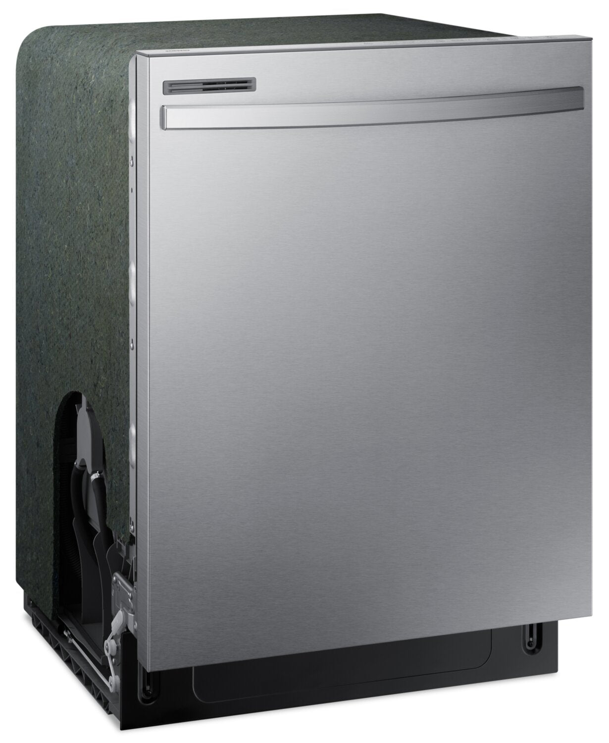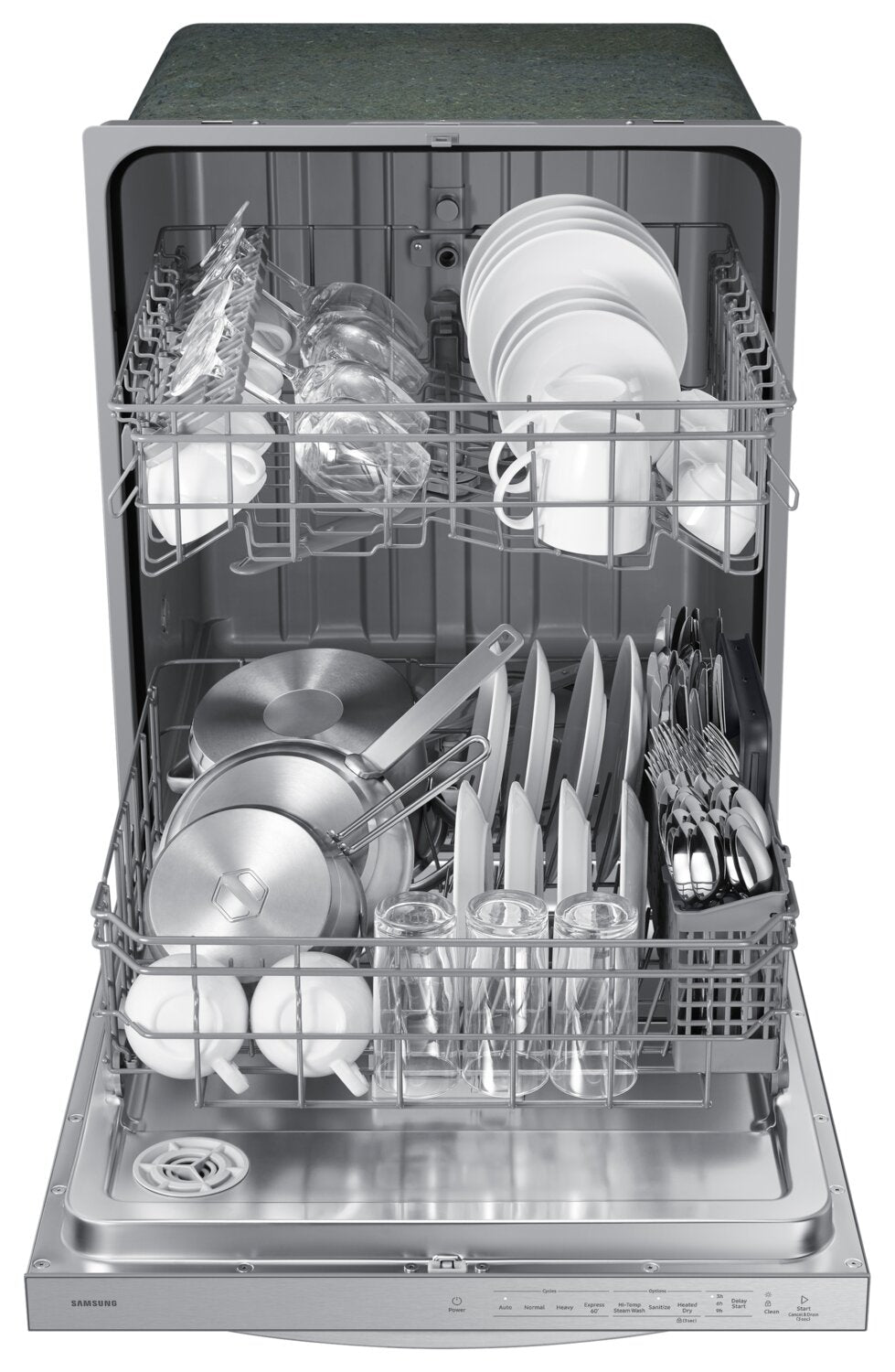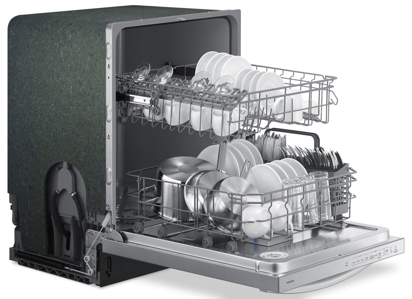 This Samsung dishwasher is thoughtfully designed with features to make post-meal cleanup a breeze. A height-adjustable top rack makes room for tall items such as pots and pans, while foldable cup shelves fit small cups and bowls without sacrificing rack space. The Express 60’ cycles washes and dries dishes in just one hour, perfect for small loads or preparing for last-minute dinner parties. Thanks to the dishwasher’s extra-quiet operation, you can enjoy a peaceful kitchen - without the background noise.