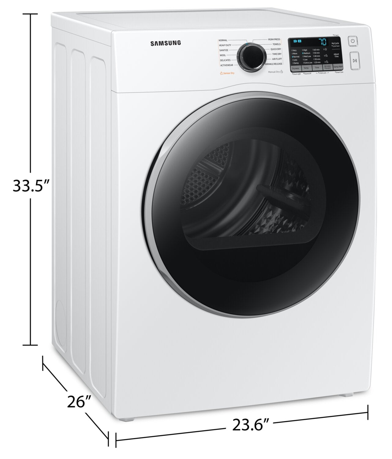 Give your clothes the care they need with this Samsung electric dryer. Using moisture sensors, the sensor dry system monitors how damp your fabrics are and adjusts the cycle temperature and length to ensure your clothes come out perfectly dry. Plus, the Smart Care feature detects and diagnoses problems, and provides easy troubleshooting solutions using a smartphone app. With a compact size and reversible door, this dryer can be placed in smaller spaces for laundry day flexibility.