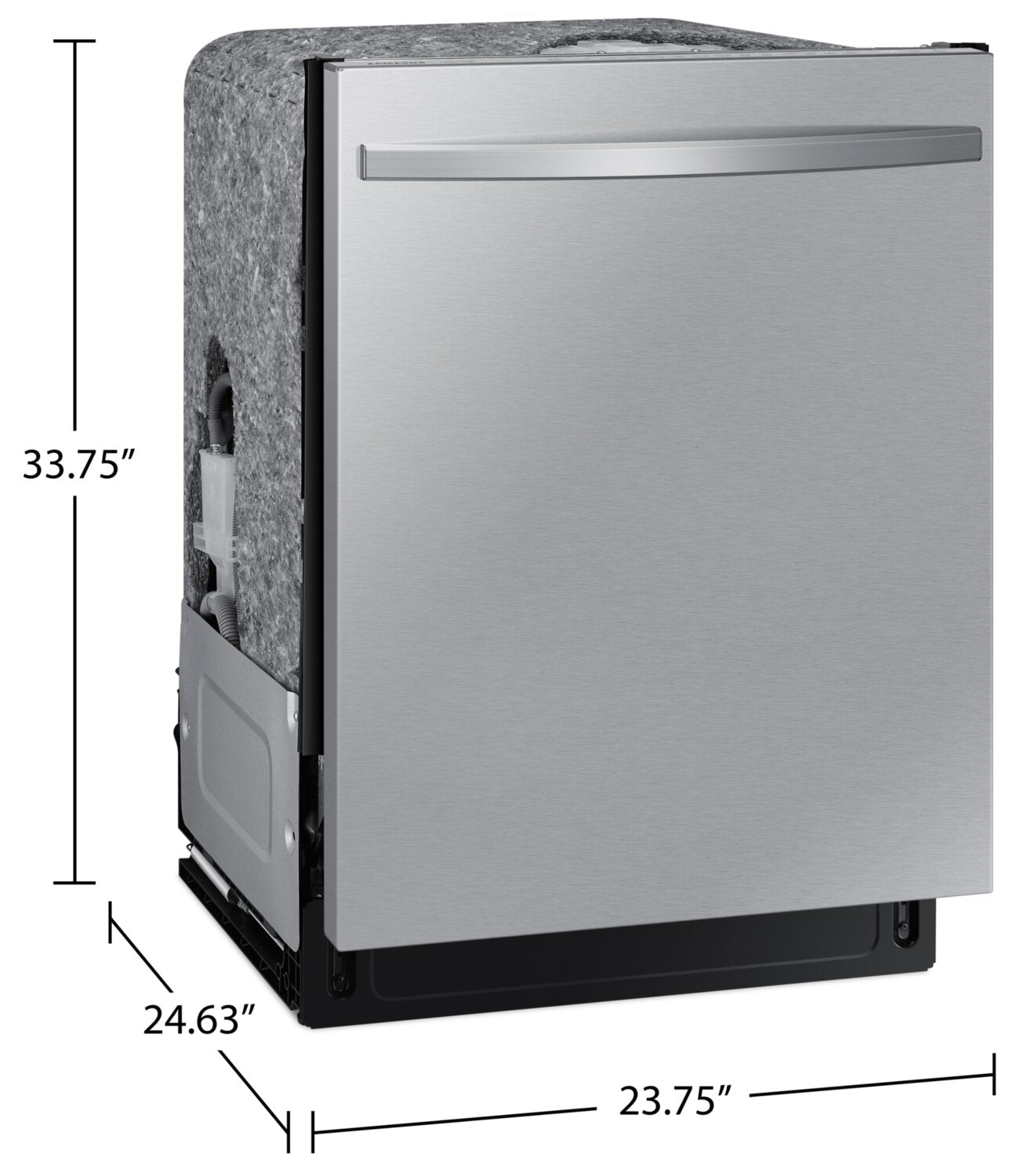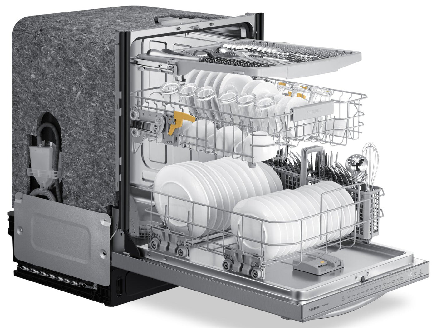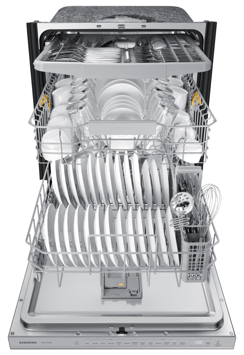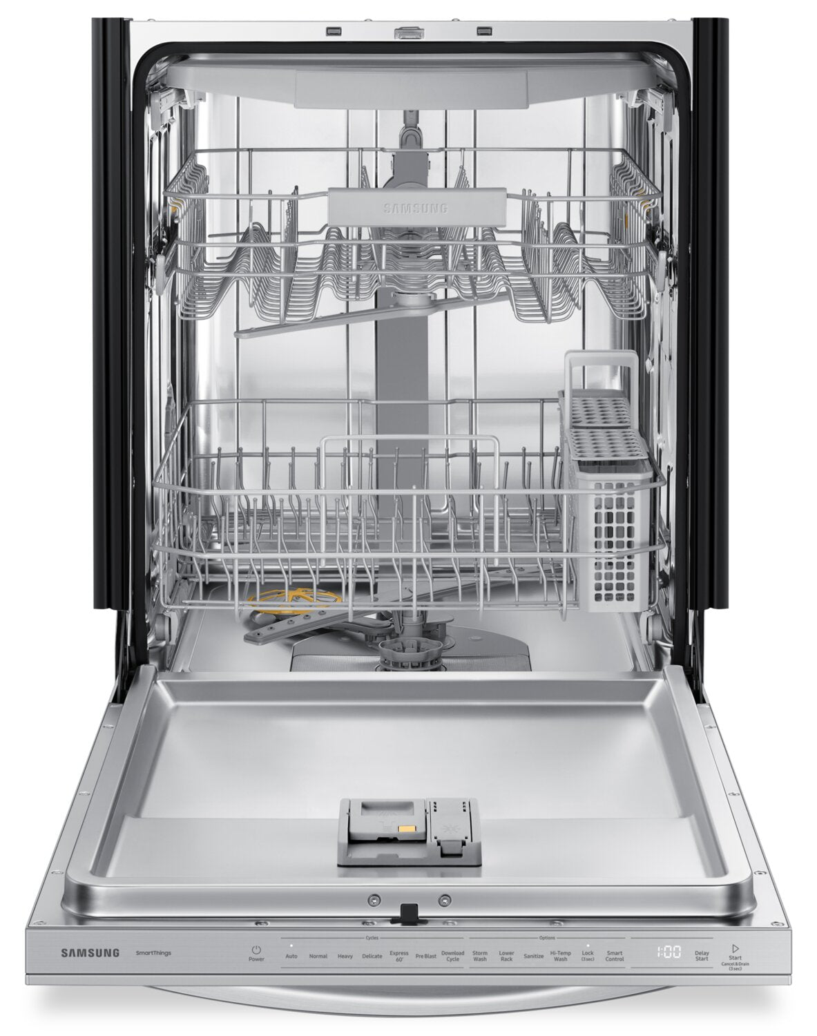 Upgrade your kitchen with the power of this Samsung dishwasher. The StormWash system blasts water from two washing arms, covering multiple angles for a thorough clean. Once the cycle is complete, the dishwasher door automatically opens to circulate air for better drying performance. From pots to spatulas, the third rack and height-adjustable upper rack provide all the loading flexibility you need. This dishwasher also meets Energy Star Certification requirements to ensure a more efficient and cost-effective cleaning experience.